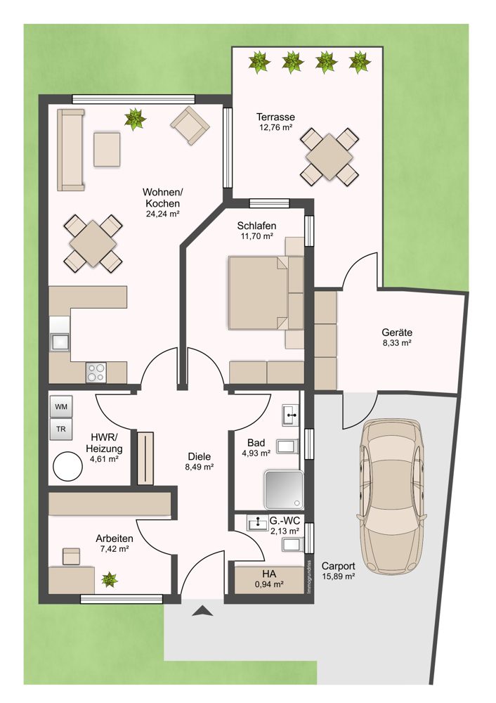 * Carport mit Geräteraum und Gartenanteil